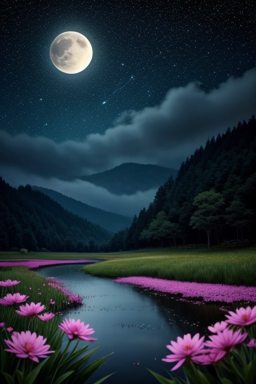 spring landscape, flowers, nature, butterflies, night sky, starry sky, moon, moon light, vivid colors, masterpiece, hyperdetailed, made out of instant noodles, detailemaximizer, realistic,