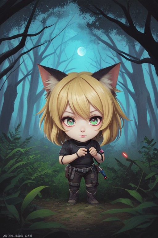 score_9, score_8_up, score_7_up, solo, peeking out, hiding behind tree, night, horror \(theme\), forest, necoarc, glowing eyes, cat ears, blonde hair, red eyes, chibi, :3, white shirt, turtleneck, looking at viewer,whole body, <lora:PeekingOut_pdxl_Incrs_v1:1> <lora:necoarc-guy-PONYv1_1:1>