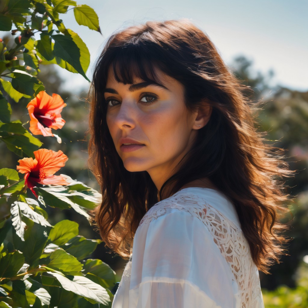 This is a photograph, from a slight angle, of a woman standing outside with hibiscus plants on a sunny day. Wearing a long sleeve, loose, semi transparent blouse which is falling off a shoulder. Head turned to look at the viewer with dark colored eyes, her shoulder length black hair with bangs frames her beautiful face. casting shadow style, perfect eyes, extremely intricate details, masterpiece, epic, clear shadows and highlights, realistic, intense, enhanced contrast, highly detailed skin, f/2.8, bokeh