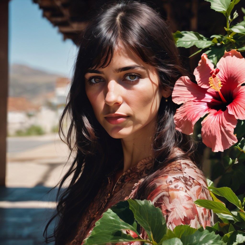 This is a photograph, from a slight angle, of a woman standing outside with hibiscus plants on a sunny day. Wearing a long sleeve, loose, semi transparent blouse which is falling off a shoulder. Head turned to look at the viewer with dark colored eyes, her shoulder length black hair with bangs frames her beautiful face. casting shadow style, perfect eyes, extremely intricate details, masterpiece, epic, clear shadows and highlights, realistic, intense, enhanced contrast, highly detailed skin, f/2.8, bokeh