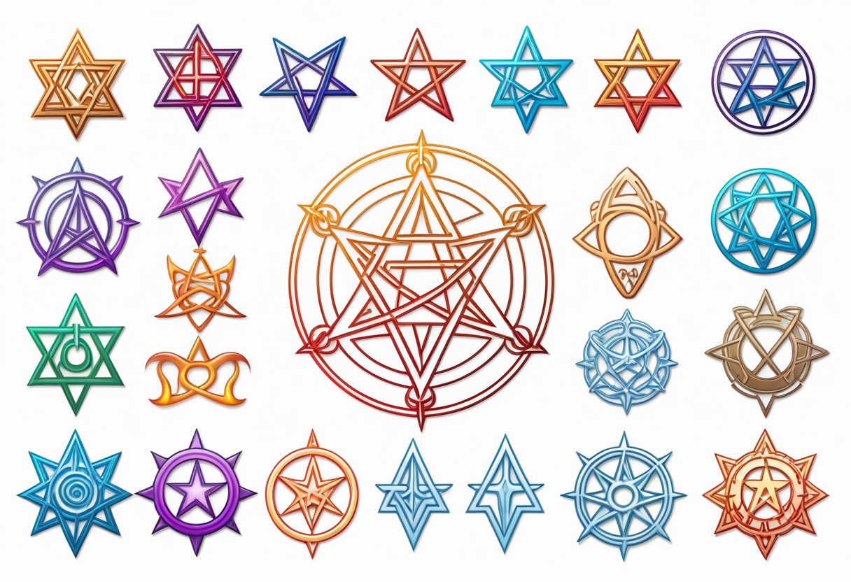 vector illustration in 3D realistic syle, shadows, photorealistic, highly detailed, ((no perspective)), 2d, occultic sigils, pentagrams, thin outline, detailed shading, colorful, items set, medium set, simple white background,