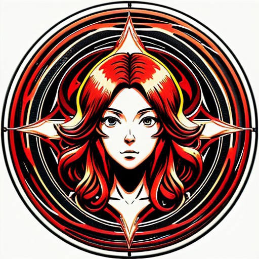 Anime style. Redhead girl. Metal art. Esoteric art. Strong stroke. Red and Orange stroke lines. Red and white outline.