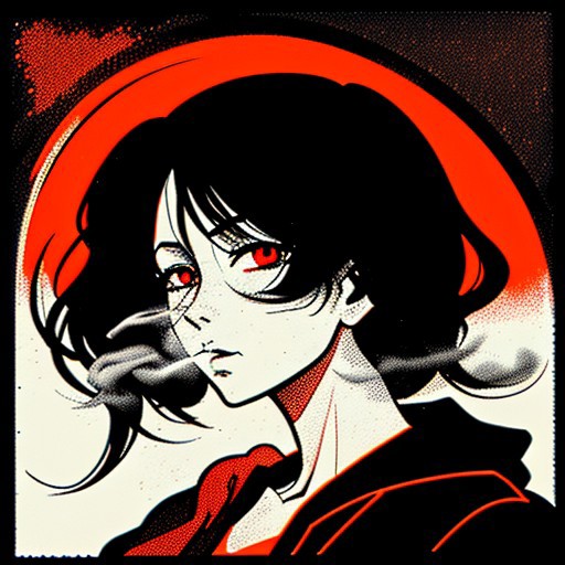 Anime girl. Black and red. Anime style. Duotone only. Black background with shapes. Orange highlights. Thick lines. Heavy strokes. Black strong lines. Red highlights. Unfinished. smoke. Shapes in background. Red OUTLINE around. Heavy outline. Pronounced outline. Heavy contrast. High saturation.