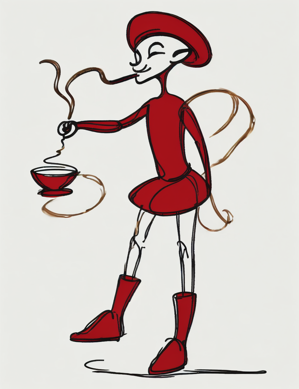 DonM0n3L1n3 one line drawing, naga, small humanoid creature, beard, hat, red clothing, 0.3:gold trim, buckled shoes and stockings, playful expression, pot of gold, smoking a pipe, short stature, 2 feet tall, tricky, mischievous <lora:DonM0n3L1n3:0.8>