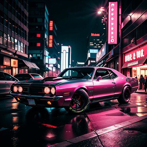 masterpiece, best quality, blue muscle car, pink lighting, neon lighting, cyberpunk city, neon, dynamic angle, exterior, ground vehicle, futuristic car, outdoors, background, 8k wallpaper, ultra detailed, masterpiece, gritty, fantasy art, natural lights, no humans,