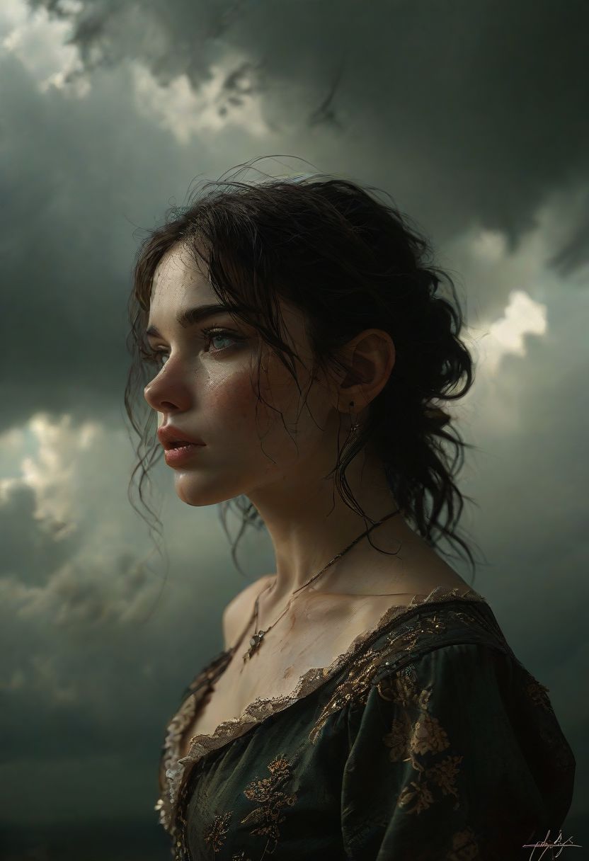 Upper body photo, side view, dutch angle,portrait of a Spanish girl, dark dreams, black hair, alluring, seductive, storm clouds, whimsical charm, ethereal glow, freckles, tack sharp focus on Green eyes, Masterpiece, intricate lines, intriguing atmosphere, sharp magnificent details, delicate features, elaborate details, (2\3 rule composition:0.5), award winning illustration by Heather Theurer and Luis Royo, volumetric lighting, eye contact with viewer <lora:add-detail-xl:1> <lora:MJ52:0.5> <lora:sdxl_lightning_8step_lora:1>