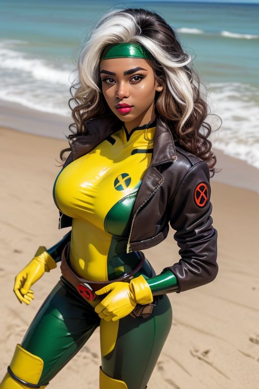 (ultra realistic,32k, masterpiece:1.2),(high detailed skin:1.1),( high quality:1.1), <lora:CARTOON_X_MEN90s_Rogue:0.7>(furrowed brow:1.1),(eyeliner,long lashes, mascara:1.1),CARTOON_X_MENs_Rogue,ownwaifu,(shiny glossy clothing:1.1),long hair,breasts,brown hair,green eyes,lipstick,makeup,lips,white hair,two-tone hair,headband,wavy hair, messy hair,curly hair,big_hair,yellow bodysuit,jacket,gloves,belt,yellow gloves,green bodysuit,bodysuit,multicolored bodysuit, superhero, skin tight,multicolored clothes, beach, sand, sunshine, palms, blurry background,,(looking at viewer, standing from above:1.1),, (huge breast,large breast:1.1),<lora:add_detail:0.99>, (volumetric lighting:1.1), tan lines, tan skin, (dark skin:1.1), dark-skinned, dark skin, (dark-skinned female:1.5), Tanlines, cleavage, cleavage, cleavage, cleavage,