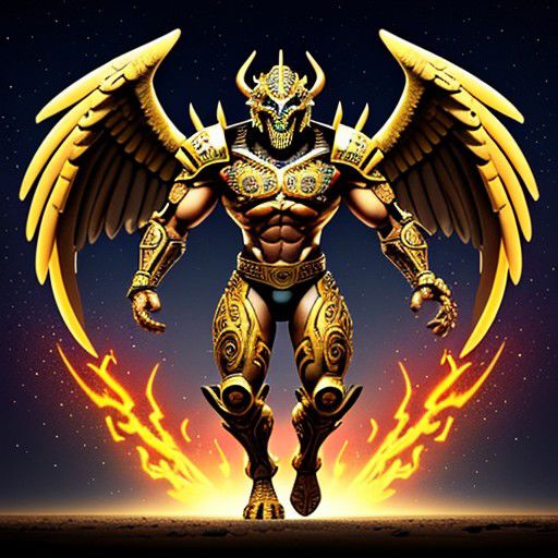 Omega Eldorado's golden form is a breathtaking fusion of ancient Aztec artistry and advanced alien technology. His sleek, metallic body gleams with an otherworldly radiance, reflecting the light of distant stars. Head: His helmet, shaped like a stylized eagle's head, bears intricate feather patterns and glyphs that glow with a soft luminescence. The visor conceals his face, revealing only the intense, golden glow of his eyes. Torso: His chest plate resembles a stylized Aztec sun disc, adorned with intricate carvings and radiating lines of energy. His shoulders are broad and powerful, with ornate pauldrons that evoke the feathered serpent Quetzalcoatl. Arms and Hands: His arms are long and muscular, ending in powerful hands capable of delivering devastating blows. His fingers are tipped with retractable energy claws, capable of cutting through steel. Legs and Feet: His legs are strong and agile, allowing for incredible speed and agility. His feet are equipped with magnetic soles that enable him to walk on any surface, even upside down. Back: A magnificent pair of golden wings, reminiscent of a condor's, fold neatly onto his back, allowing him to soar through the skies at incredible speeds.