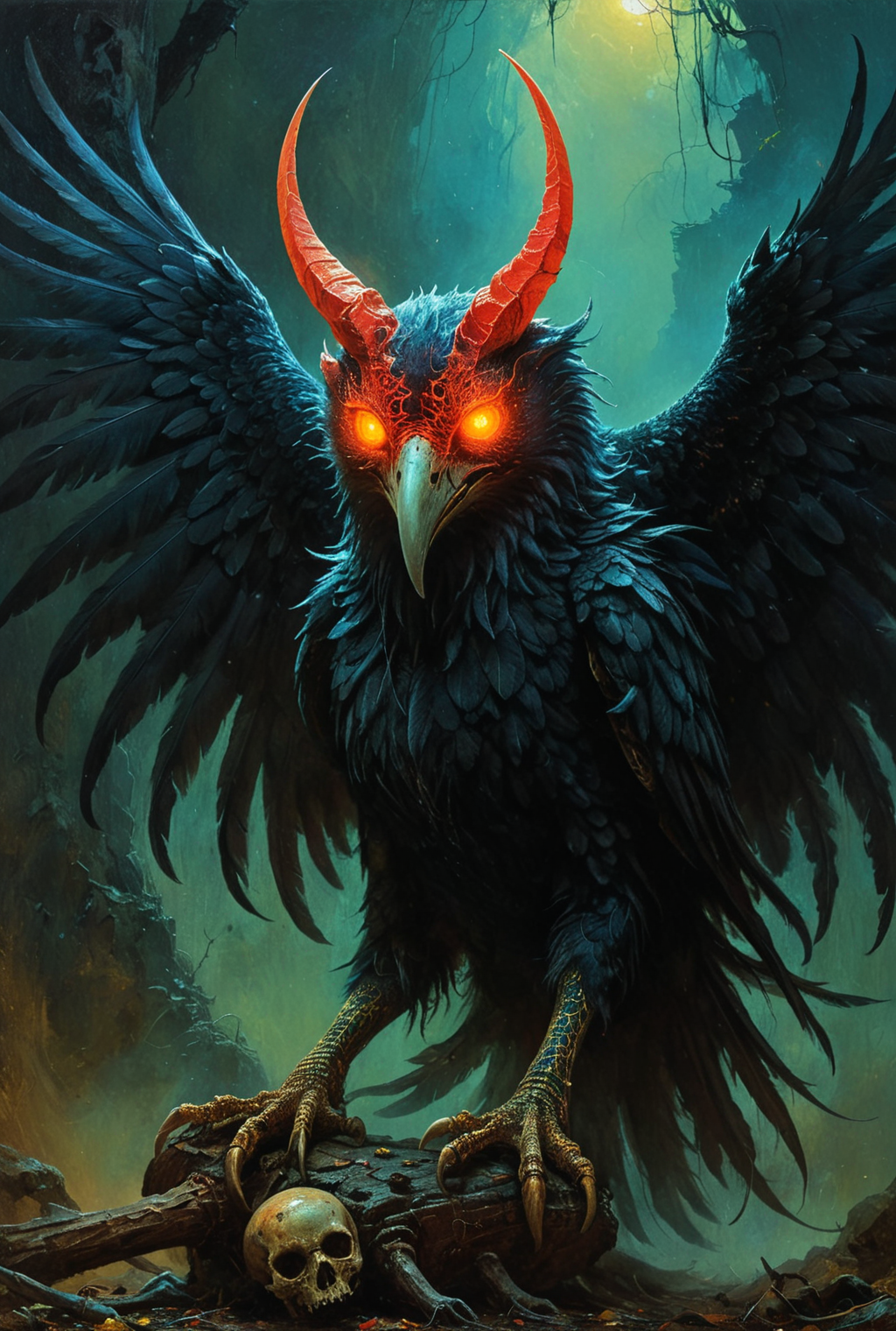 wings in the night, feathers, glowing eyes, claws, beak, dance macabre, giant, hellsraiser, solo best quality, masterpiece, absurdres, surreal, dramatic, tragic, mysterious, colorful, vibrant colors, color contrast, primary colors, artstation contest winner, Wide range of colors, high Dynamic, light particles, aesthethic, (bright lit, fully visible:1.2) thrilling, professional, excellent composition, visualy stunning, disturbing, beyond reality <lora:sdxl_lora_beksinski:0.35> digital artwork by Beksinski <lora:20240625-1719322976670:0.4> FRESHIDEAS Dark RPG old-school style <lora:RMSDXL_Creative:0.5> <lora:DetailMaximizer:0.35> <lora:XSfenlie:0.35> fenliexl, mixed media Robert Ervin Howard, Edgar Rice Burroughs <lora:tbh266-sdxl:0.25> style of Bestiary <lora:TheWeirdies_V2:0.5> theW3iRDi3Sv2 <lora:great_lighting:1> great lighting