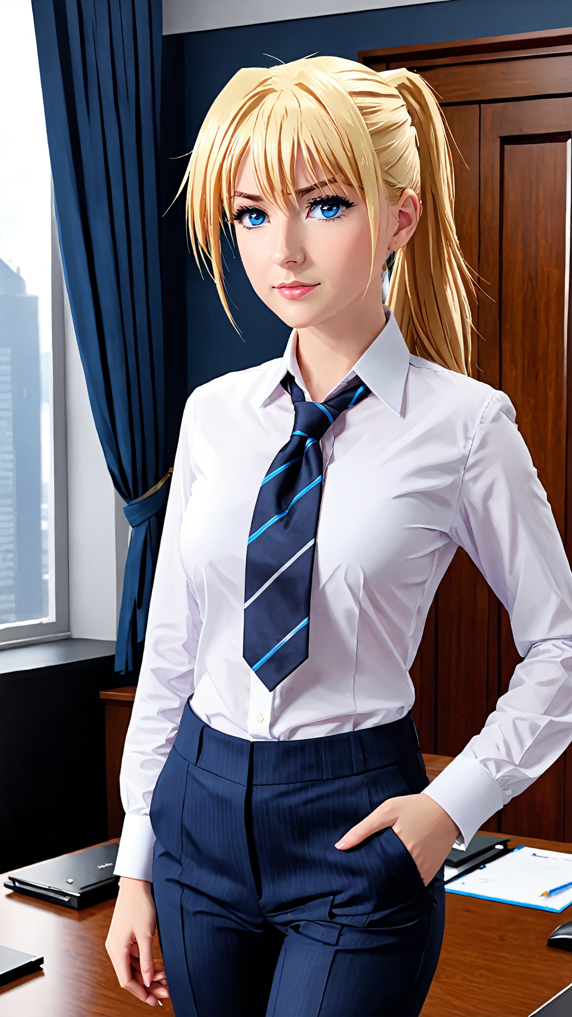 masterpiece, best quality, <lora:heroneverseenagain.sdxl.v2:0.95> heroneverseenagain 1girl, blond hair, blue eyes, (ponytail), office suit, necktie,pants, indoors,