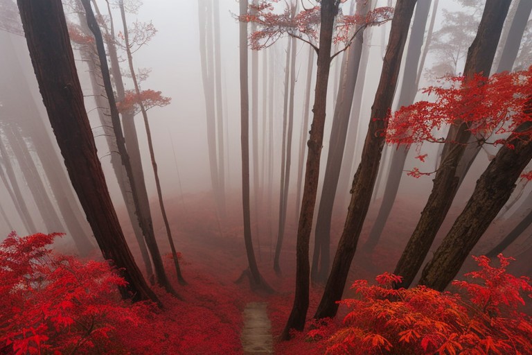 ((overlooking an exotic alien)), red forest, sharp trees, towering trees with broad openings, red leaves on trees, foggy day, brown mossy ground, brown grass