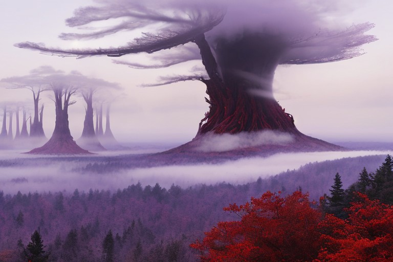 ((overlooking an exotic alien)), red forest, sharp trees, towering trees with broad openings, red leaves on trees, foggy day, brown mossy ground, brown grass, ((purple steam rising)), lots of single tall trees around