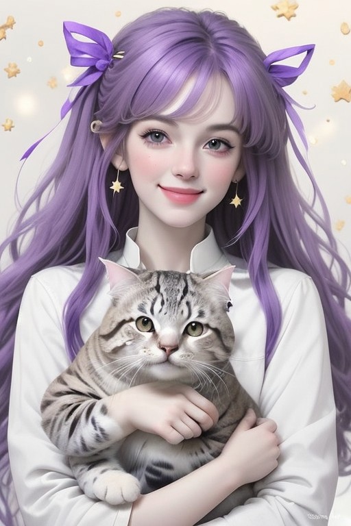 2d anime, kawaii, details, masterpiece, best quality, CG, detailed light, extremely detailed, royalty, HDR, intricate details, 1girl, solo, long hair, looking at viewer, blush, smile, bangs, blue eyes, simple background, shirt, hair ornament, long sleeves, white background, bow, ribbon, holding, animal ears, jewelry, closed mouth, purple eyes, hair ribbon, white shirt, upper body, purple hair, hair bow, artist name, cat ears, signature, twitter username, star \(symbol\), animal ear fluff, :3, animal, wavy hair, cat, white bow, cat girl, light particles, star hair ornament, holding animal, symbol in eye, star in eye, white cat, holding cat, animal hug,