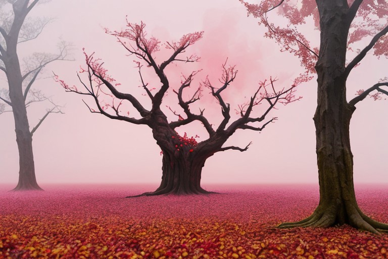 ((overlooking an exotic alien)), red forest, sharp trees, towering trees with broad openings, red leaves on trees, foggy day, brown mossy ground, brown grass, ((pink fruits on tree)), ((pink fruits fallen on the ground)), pink fog