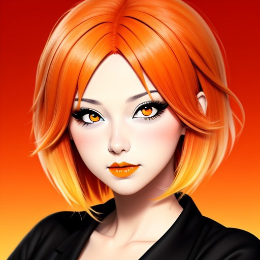 Anime style girl. Black and white and orange. Orange eyes. Orange Lips. Duotone hair. Gradient hair. Red background.