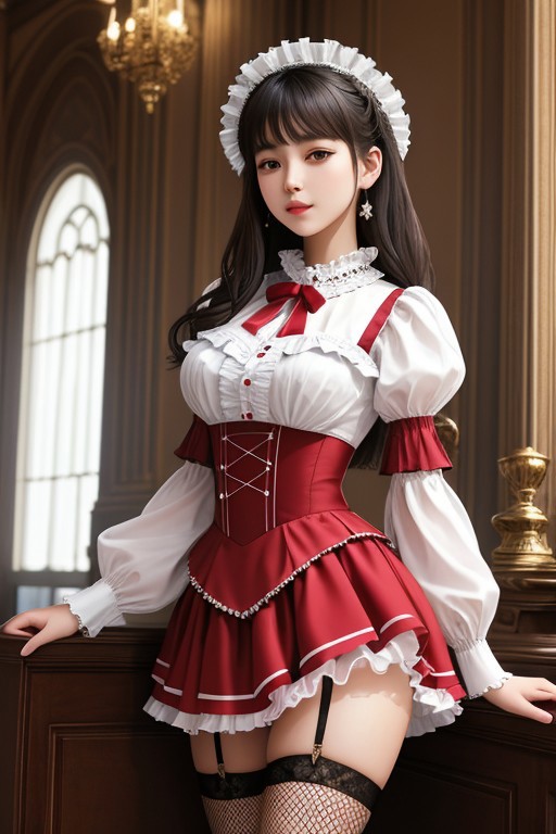 Masterpiece, high quality, 4K, beautiful design, shiny, from the front, award winning photo, extremely detailed, amazing, fine detail, absurdres, soubrette, a woman posing for a picture , wearing a soubrette outfit, frills, fishnets, ribbons, open top, no skirt <lora:Soubrette:0.7>