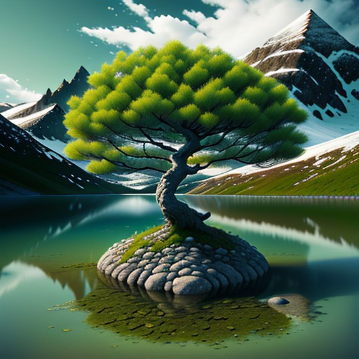great magical pine tree rising out of the water of a great lake on a snowy mountain