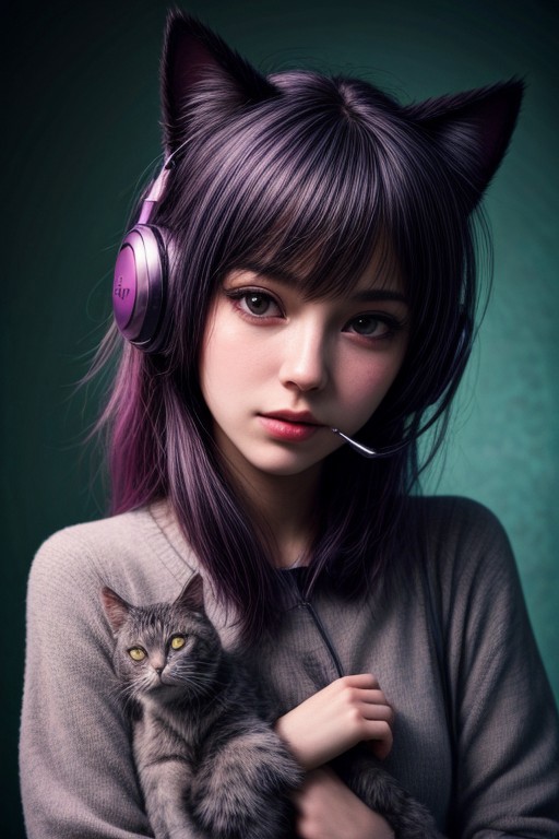 (masterpiece, best quality, highres:1.2), raw portrait photo of cute Girl with headphones, cat ear headphones, colored hair, in high detailed textured, (most iconic photo), (dynamic background), depth of field, morbid, dynamic time, (light smile:0.3), SFW,