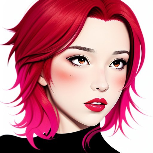 Redhead sexy girl in anime style. Redhead, Red eyes, Bright pink lips. Black and white, red, pink colors only. Very strong thick black lines. Heavy strokes by 10p. White background.