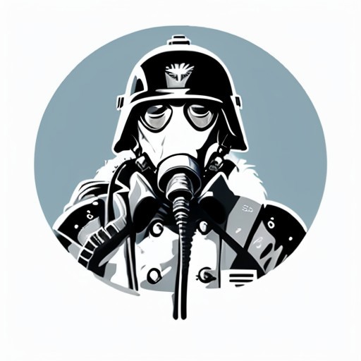 (Digital Illustration), Death Korps of Krieg Soldier, dkok, helmet, Model 4 gasmask with tube, (oxygen pack), cold weather gear, white uniform, fur lined, bloody, portrait, dynamic composition, bold lines, blue splashes, winter war, (((line art))), linear, limited color palette, ((minimalist line art, pop art, solid colors, minimalist)), (((flat colors)), (((minimalist shading, unshaded)))), small lenses, circular lenses