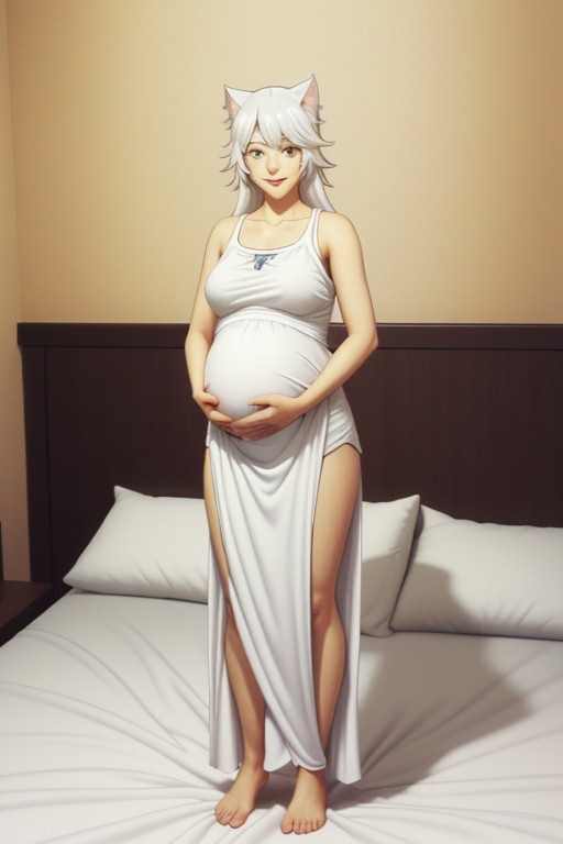 score_9, score_8_up, score_7_up, pregnant belly, happy, smile, closed mouth, bedroom, GranartNeedakitta, dark skin, white hair, very long hair, yellow eyes, slit pupils, cat ears, full body,