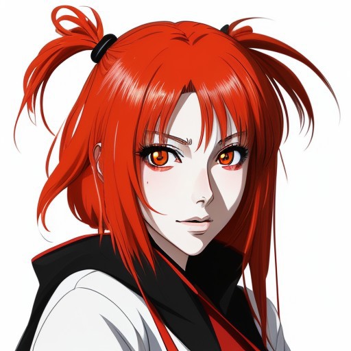 Anime Girl. Anime style. White background. Strong thick red-dark lines. Red highlights. Highlights. Black, white, red and orange. Red shadows.