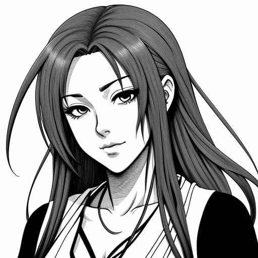 Anime redhead girl. Black and white. Anime style. White background with shapes. Thick lines. Heavy strokes. Black strong lines.