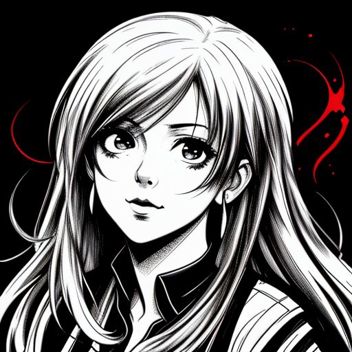 Redhead Anime girl. Black&white. Duotone: Red- Black. Black thick strong fat black lines. METAL ART. White background. Thick Lines. Strong Lines. Duotone Background.