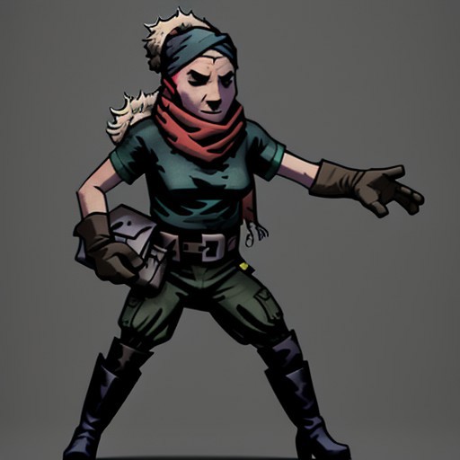 masterpiece, best quality, 1girl acrobat, (loose outfit, scarf around neck, tshirt, fur belt, boots, gloves, baggy pants), full body, sketch, fire effects, darkest dungeon, solid gray background <lora:DarkestDungeon_hard:1>