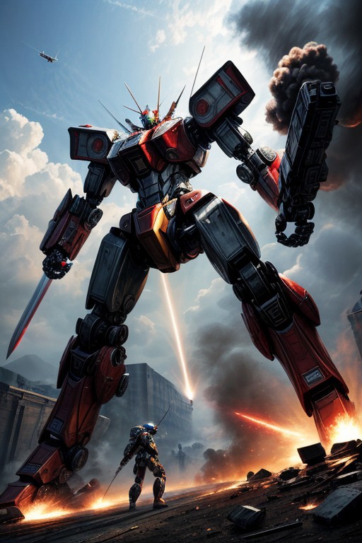 masterpiece, best quality, absurdres, illustration, photorealistic, cinematic, dynamic, mecha, dueling robots, energy swords, destruction, laser beams, smoke and debris, epic confrontation