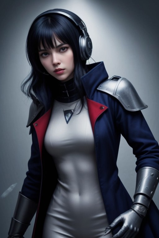 Time Patroller Alex: Female, with long straight dark blue hair and bangs on her forehead. Wearing silver headphones, a black high-collar tight-fitting battle suit, a red sleeveless long coat, black gloves, a silver gauntlet on the left forearm (with an oval sapphire in the center), and a silver beam pistol in the right hand (with a triangle on the front of the pistol head) cone-shaped yellow sapphire). FHD, masterpiece, realistic style.