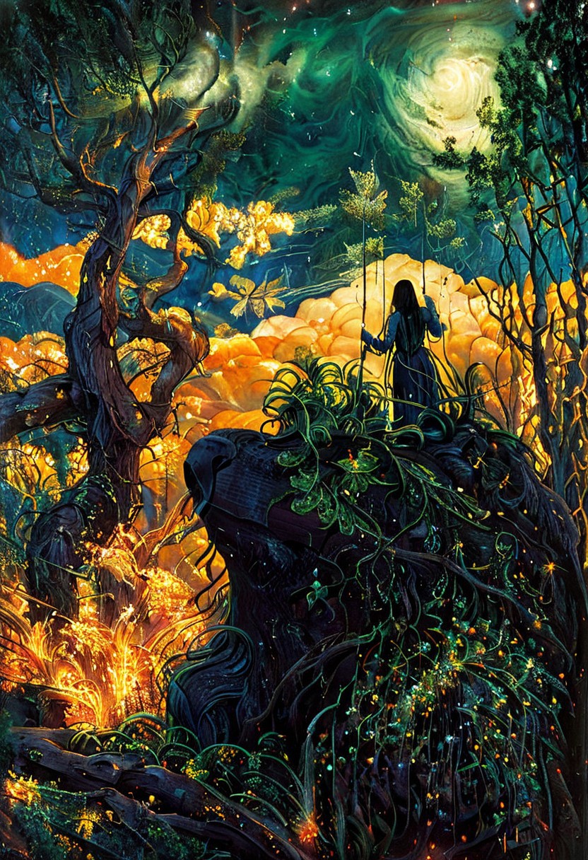 As when upon a tranced summer-night, Those green-rob'd senators of mighty woods, Tall oaks branch-charmed by the earnest stars, Dream and so dream all night without a stir, Save from one gradual solitary gust, Which comes upon the silence and dies off, As if the ebbing air had but one wave, So came these words and went the while in tears, She touch'd her fair large forehead to the ground, Just where her falling hair might be outspread, A soft and silken mat for Saturn's feet, detailed, dark art, painting, landscape, best quality, 8k, hdr, by charles tunnicliffe, by george dawe