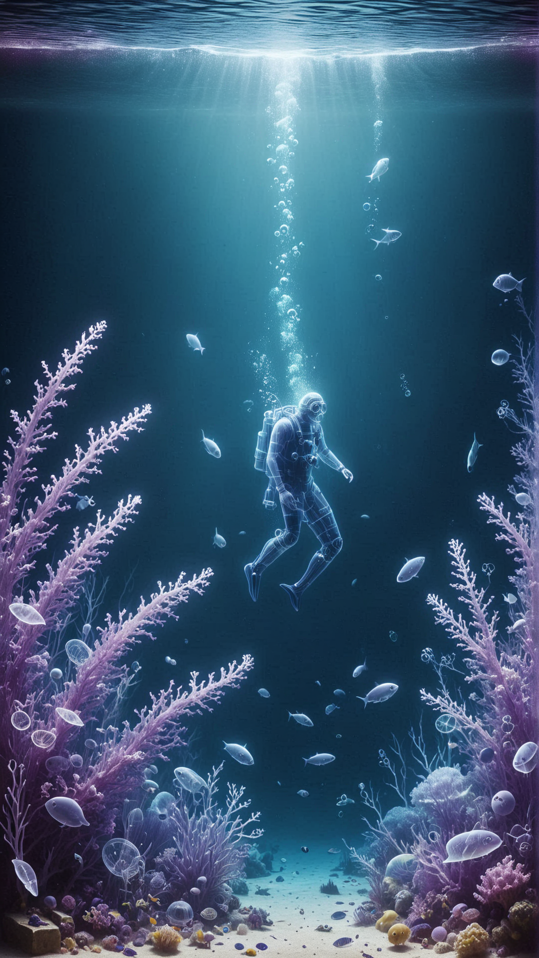 <lora:XRayStyleSDXL:1.5>XRayStyle, Lilac divers discovering a haunted wreckage within an underwater coral reef (transparent:0.7), (see-through:0.7)