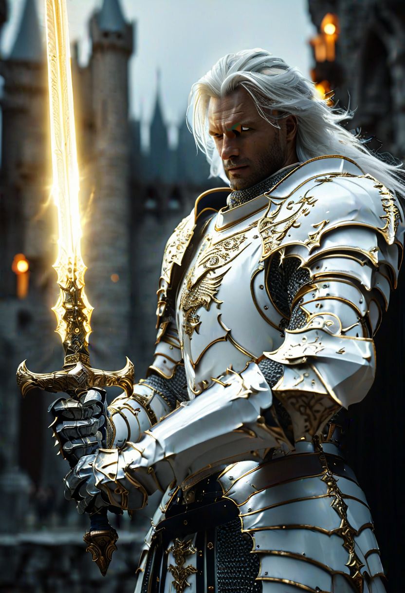 Cinematic shot of a knight wearing a white and gold armor, white hair, holding glowing sword, castle in background, HKStyle, HD, masterpiece, best quality, hyper detailed, ultra detailed, super realistic