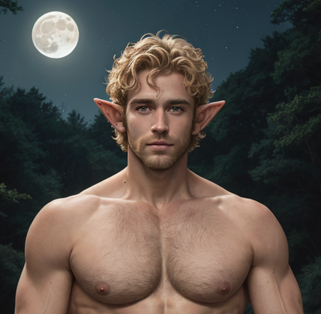 scruffy handsome hunk, muscular chest, blonde curly hair, shirtless, upper body, (large protruded nipples:1.2), detailed face, (looking at viewers), moon, (elf ear), in the water of a great lake, forest, night, best quality, highres, 8k, realistic
