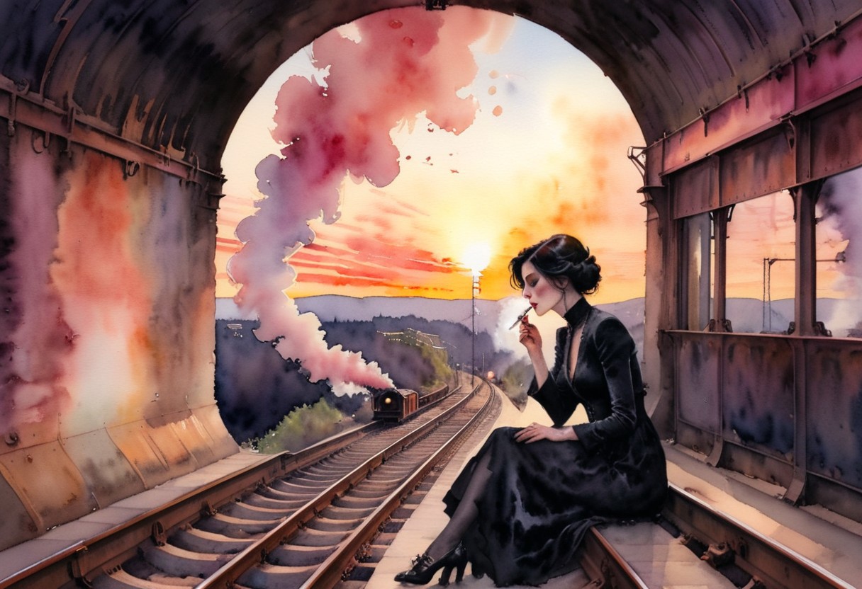 the countess, sitting in her favourite spot above the mouth of the train tunnel, a wash of liminal nostalgia, medicine for the soul, sunset tinged with rosy hues, the echoes of memory, tug gently at her watercolor_mood, filigreed smoke plumes climb from the end of her cigarette, the familiar rumble of the 9 o'clock express, a rush of wind as it passes, she looks down at the roofs of the train cars counting them as they pass below, for the moment life is good, interpretative, capturing the essence of bittersweet emotion, depicted as a painting,