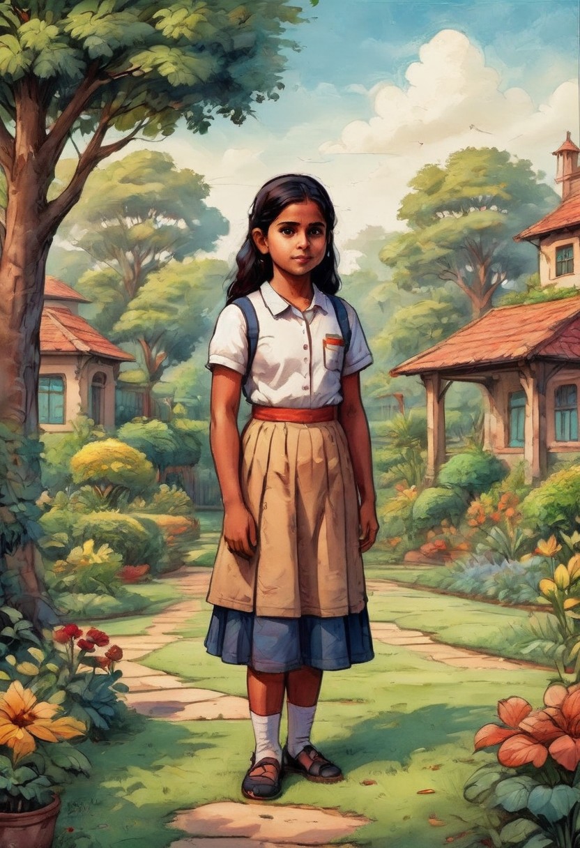 A cute little Indian girl (wearing school uniform) standing in the garden, full body, watercolor painting, intricate details,8k, children's book illustration style, Disney style,