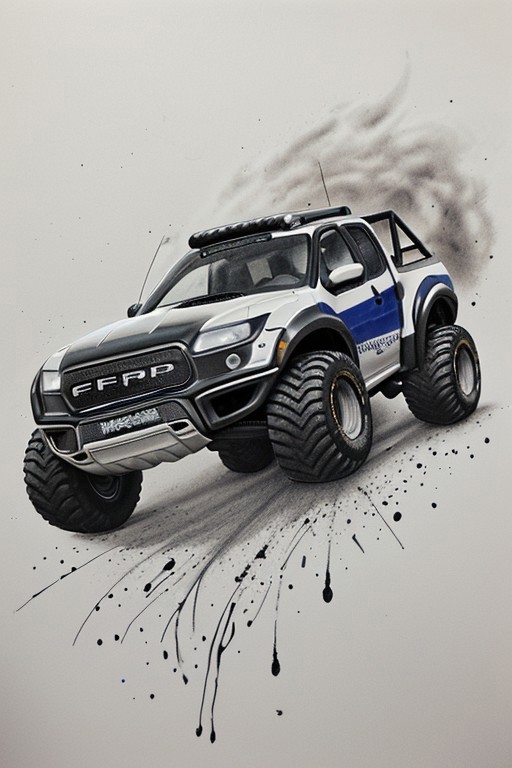 pencil drawing , ((Ford Focus Raptor pickup monster-truck)) ,style ink illustration, on parchment, ink splashes, ink stains, ink smears, faded ink,