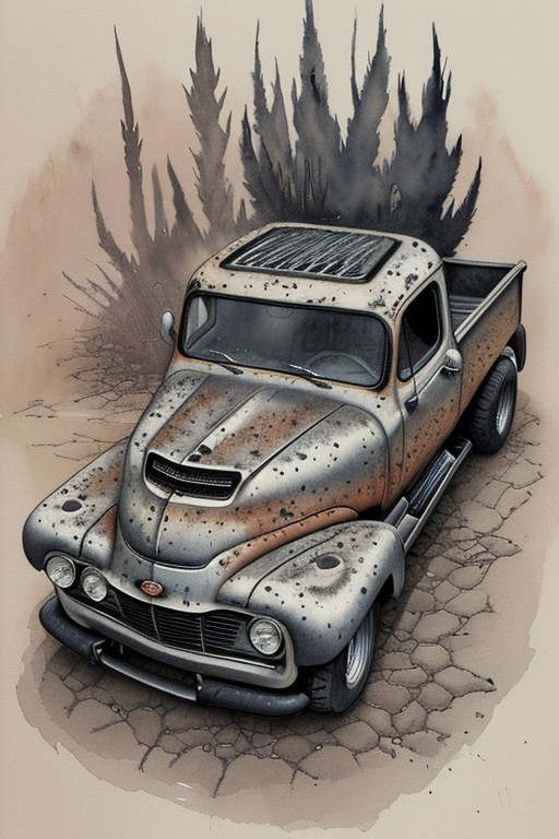 watercolor illustration of p3tr4_morg4n, (art by luis royo) , ((Hot-Rod pick-up monster-truck)), old style ink illustration, on parchment, ink splashes, ink stains, ink smears, faded ink,
