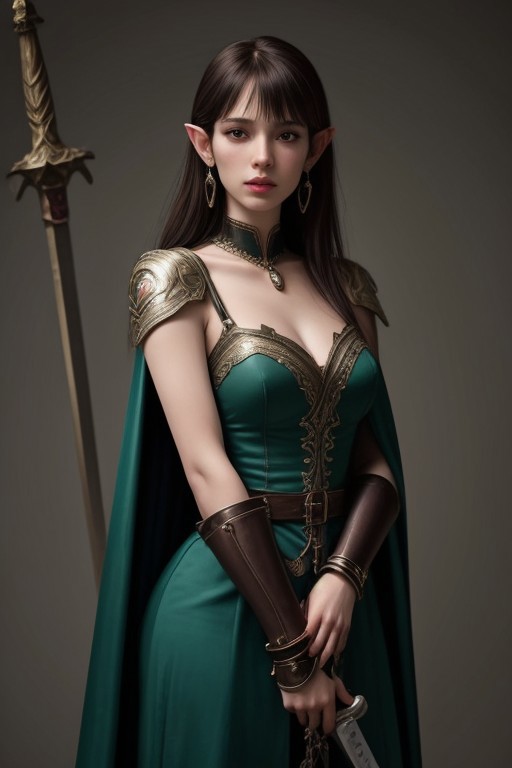 An elf woman with long straight blond hair and bangs on her forehead. Wearing earrings, a green sleeveless dress, blue metal shoulder pads connected with neck ornaments, blue breastplate, blue cloak, brown gauntlets (length and wrist), brown boots, and holding a sword in his right hand. FHD, masterpiece, realistic style.