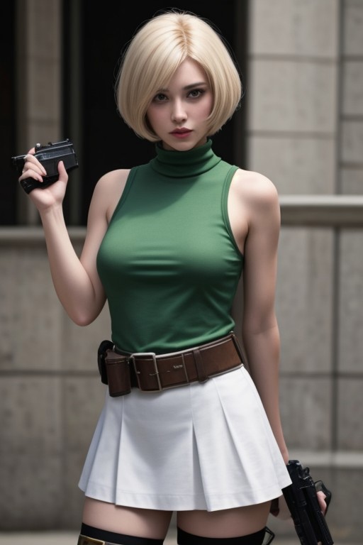 A woman with a blonde bob haircut, wearing an orange turtleneck sleeveless T-shirt, a white bulletproof vest, a green skirt, brown boots, and holding a gun in her right hand. FHD, rich in detail, masterpiece, realistic style, canon 5D4.