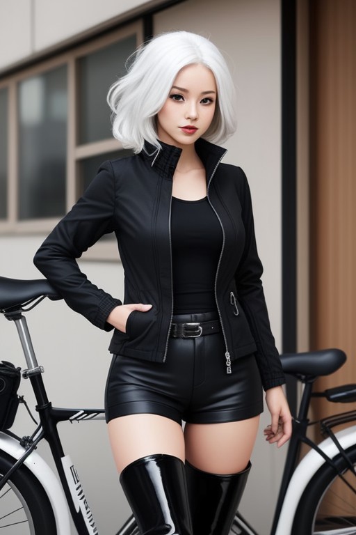 black jacket, black skirt, black bike shorts, thigh boots, 1girl, Japanese, white hair,