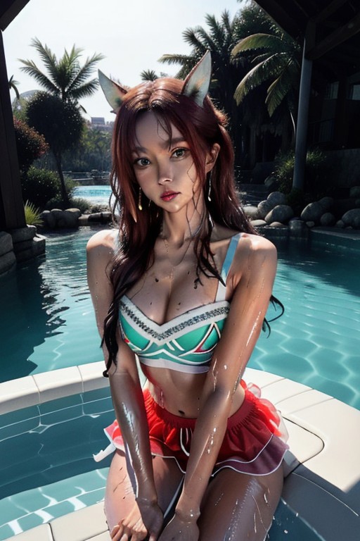 (masterpiece, best quality), female late twenties, muscular, maori, green eyes, unusual ears, aquiline nose, high jawline, , dark auburn messy bun hair, awe wearing embroidered thong, ((sexy transparent wet bikini)), detailed pussy,cami set, slides, , arms wrapped around knees, showing vulnerability. mimicking raytracing and HDR effects and resembling an 8K resolution image quality, reflection, shine, night, Photograph Taken on Nikon D750, Elegant, Scenic, Hyper Realistic, Hyper Detail.red panties
