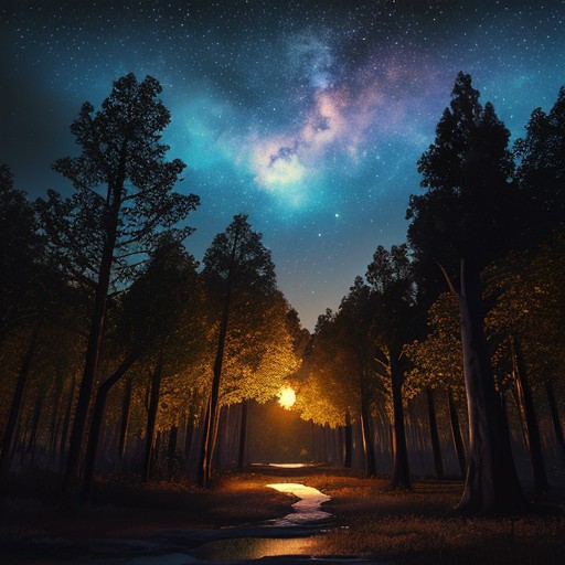 masterpiece, 8k, enchanted forest, beautiful sky, night, extremely detailed, slender black silhouette in the background, photorealistic