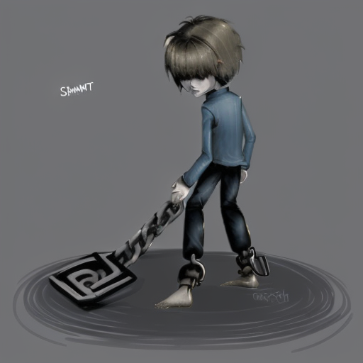 Short haired boy, Metal cuff on boy's leg, Boy chained up, Boy wearing blue shirt and black pants, Boy with a chained leg
