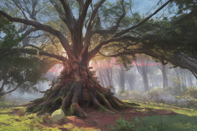 In Celestia's Glade, ancient trees transformed into vibrant canvases every morning at sunrise, their trunks and branches changing hues to create a kaleidoscope effect that danced across the sky.