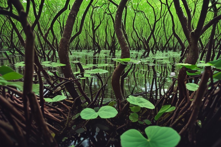 Deep dark mangrove forest, in focus a branch with a small blue frog