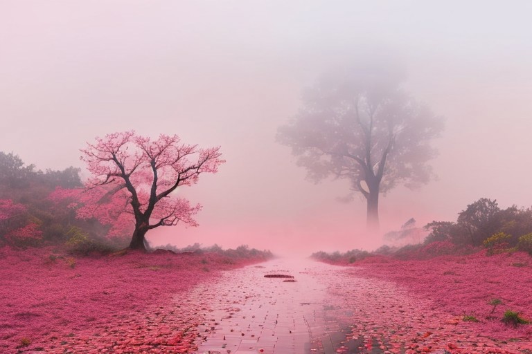 ((overlooking an exotic alien)), red forest, sharp trees, towering trees with broad openings, red leaves on trees, foggy day, brown mossy ground, brown grass, ((pink fruits on tree)), ((pink fruits fallen on the ground)), pink fog, ((raining)), ((heavy rains)), heavy blue rain