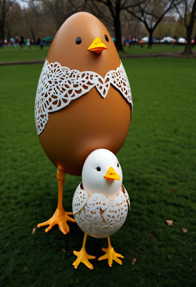 made of egg, made of egg_shell, a giant parent egg on legs is walking in park with a baby chick, detailxl