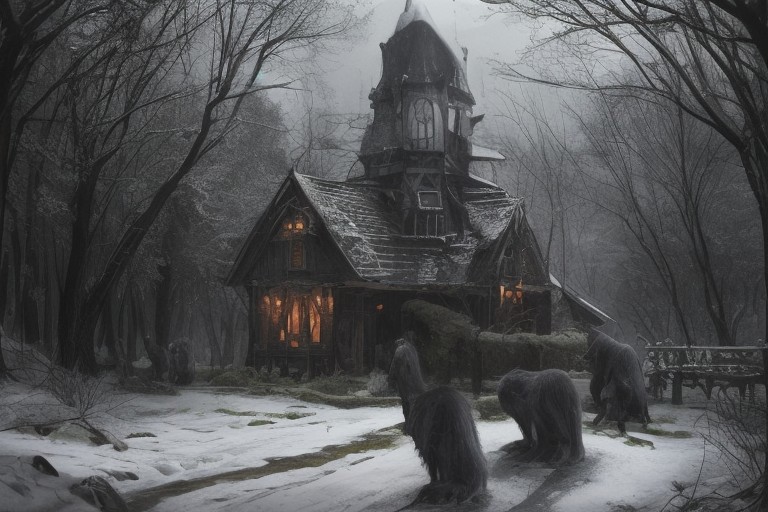 Dark Haunted Mansion Surrounded by Enchanted Forest Creatures. Horror, Mystery, Thriller, Realism.